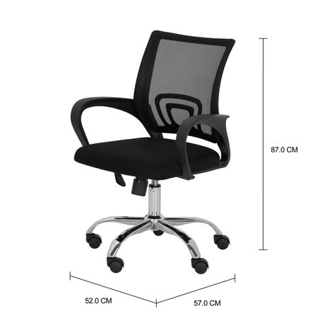 Possui encosto em tela sintética com apoio para lombar e rodízios plásticos. Carga máxima suportável: 120kg.Altura até o assento: 48.5 cm (mínima)/ 54 cm (máxima) e até os braços: 67 cm (mínima)/72,5 cm (máxima).