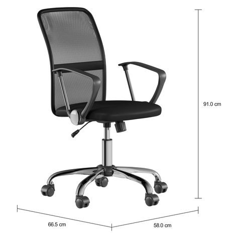 Possui braços em polipropileno, apoio para lombar e rodízios em nylon. Carga máxima suportável: 120kg.Altura até o assento: 45 cm (mínima)/51,7 cm (máxima) e até os braços: 66 cm (mínima)/73,5 cm (máxima).