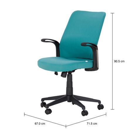 Cadeira giratória, com base em nylon e assento em compensado multilaminado com espuma e tecido. Possui braços em polipropileno, regulagem de altura a gás, função relax no assento/encosto e rodízios em poliuretano.