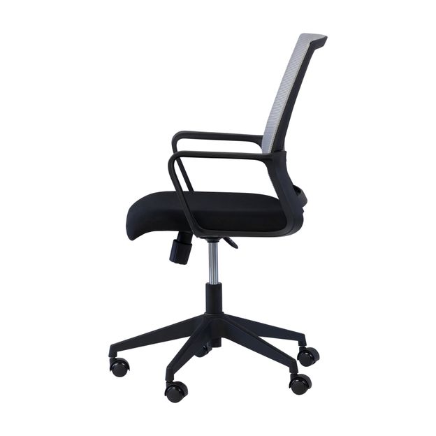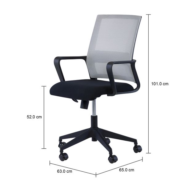 Cadeira giratória, com base em nylon, braços em plástico e assento em compensado multilaminado revestido com espuma e tecido. Possui encosto em tela sintética, regulagem de altura a gás, função relax no assento e encosto e rodízios plásticos.