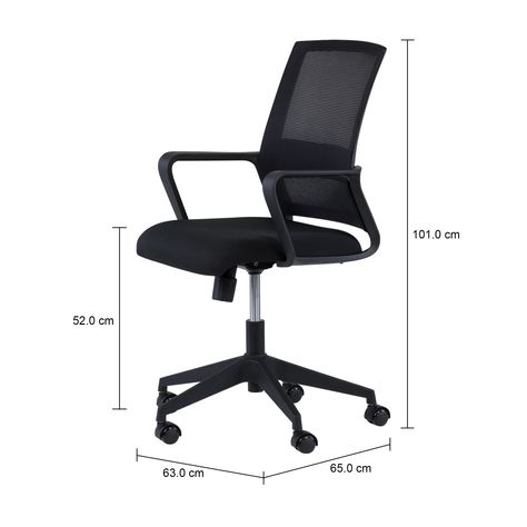 Cadeira giratória, com base em nylon, braços em plástico e assento em compensado multilaminado revestido com espuma e tecido. Possui encosto em tela sintética, regulagem de altura a gás, função relax no assento e encosto e rodízios plásticos.