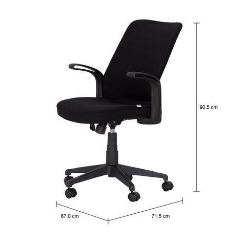 Cadeira giratória, com base em nylon e assento em compensado multilaminado com espuma e tecido. Possui braços em polipropileno, regulagem de altura a gás, função relax no assento/encosto e rodízios em poliuretano.