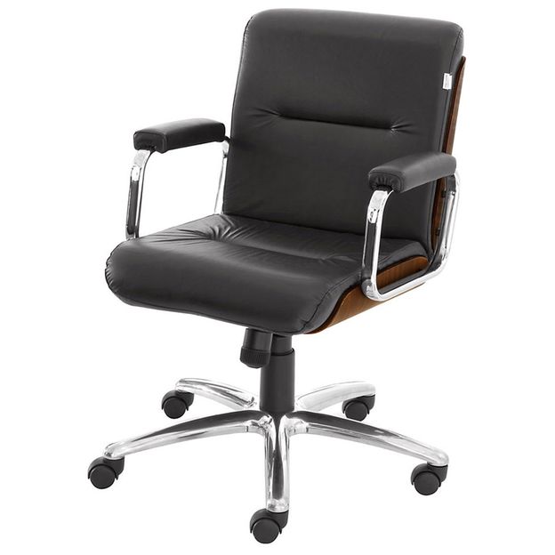 Cadeira giratória, com base em tubo de alumínio polido e assento/encosto em compensado com espuma (D35/assento e D26/encosto) e revestimento sintético em PVC. Possui braços em tubo de aço cromado e regulagem de altura a gás com pistão classe 3.