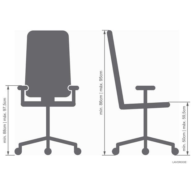 Possui função relax no assento/encosto e rodízios em nylon. Carga máxima suportável: 100kg.Altura até o assento: 50 cm (mínima)/59,5 cm (máxima) e até os braços: 88 cm (mínima)/97,5 cm (máxima).