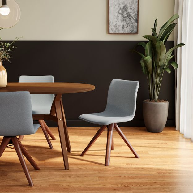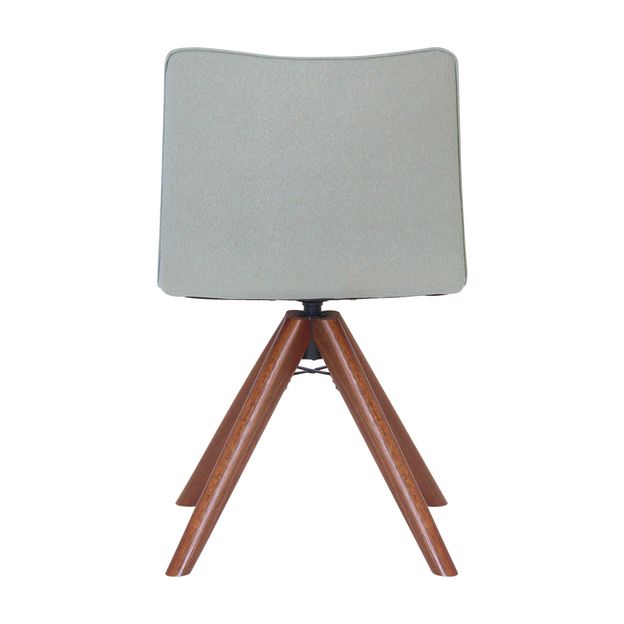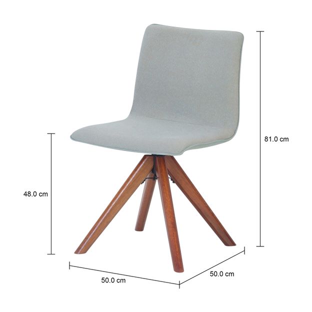 Cadeira giratória, com base em madeira maciça (Eucalipto) tingida com aplicação de verniz e assento/encosto em compensado multilaminado revestido com espuma (D28) e tecido 100% poliéster com detalhes em debrum.