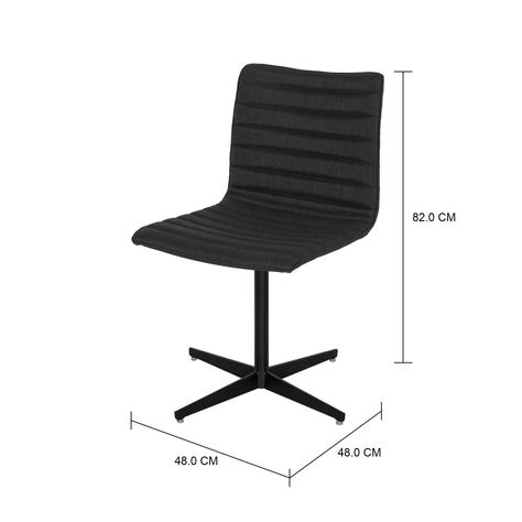 Cadeira giratória, com base em tubo de aço com acabamento em pintura epóxi-pó e assento/encosto em compensado multilaminado revestido com espuma (D28) e tecido 73% polipropileno/27% poliéster. Possui sapatas plásticas reguláveis.