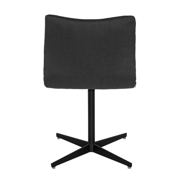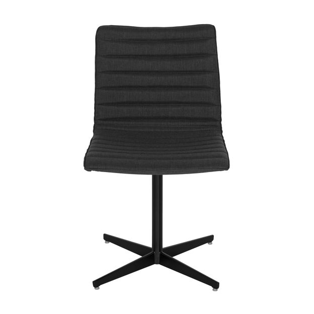 Cadeira giratória, com base em tubo de aço com acabamento em pintura epóxi-pó e assento/encosto em compensado multilaminado revestido com espuma (D28) e tecido 73% polipropileno/27% poliéster. Possui sapatas plásticas reguláveis.