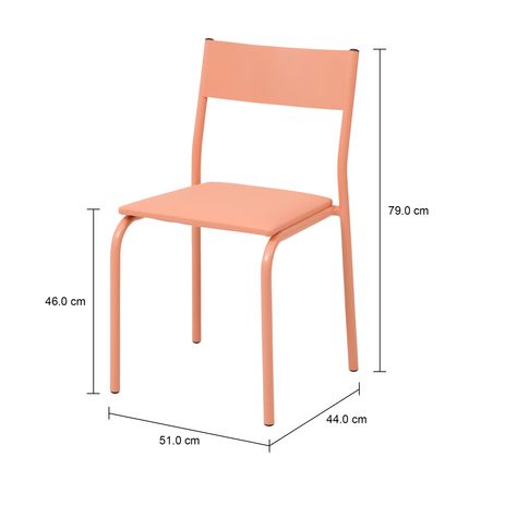 Cadeira empilhável, com estrutura em tubo e chapa de aço com acabamento em pintura epóxi-pó. Possui assento em compensado com espuma de poliuretano (D23) e revestimento sintético em PVC. Possui sapatas plásticas.