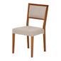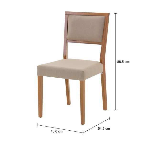 Cadeira com estrutura em madeira maciça (Eucalipto) tingida com aplicação de verniz. Possui assento e encosto em OSB (Oriented Strand Board), revestidos com espuma (D30/assento e D18/encosto) e tecido 100% poliéster.