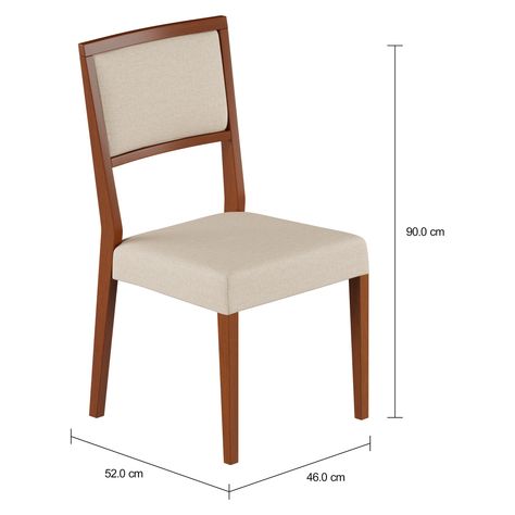 Cadeira com estrutura em madeira maciça (Eucalipto) tingida com aplicação de verniz. Possui assento e encosto em OSB (Oriented Strand Board), revestidos com espuma (D30/assento e D18/encosto) e tecido 100% poliéster.