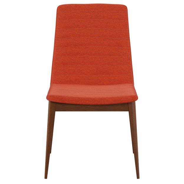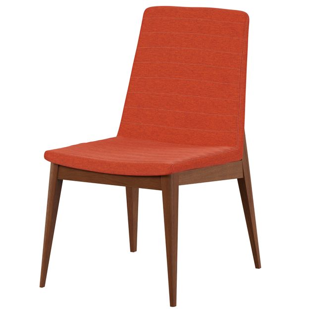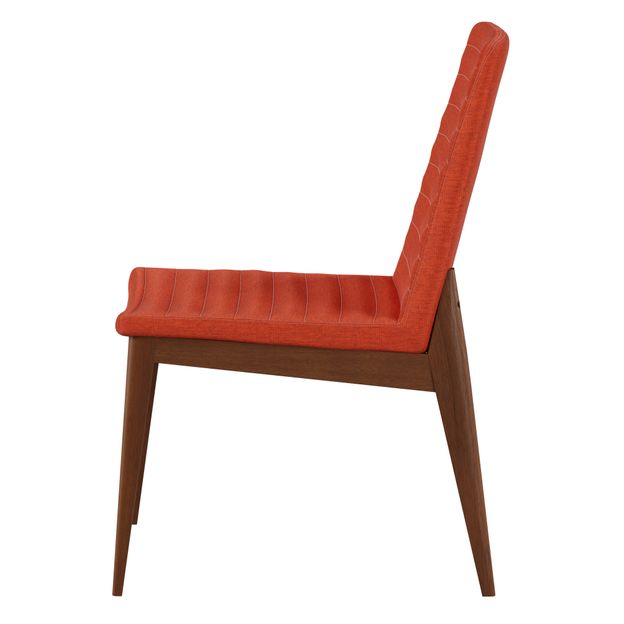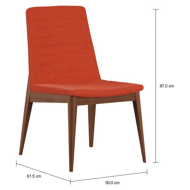 Cadeira com estrutura em madeira maçica (Eucalipto) tingida com acabamento em verniz. Possui assento em MDF e encosto em compensado revestidos com espuma (D28/assento e D23/encosto) e tecido 37% algodão/35% poliéster/28% polipropileno.