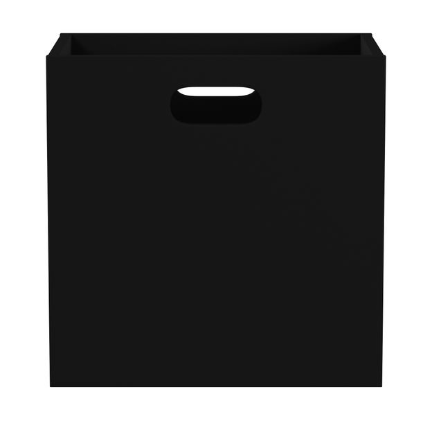 Caixa em MDF (Medium Density Fiberboard) com acabamento em pintura por impressão e bordas em PVC. Possui alças com recorte usinado. Para uso com estantes da mesma linha (vendidas separadamente).