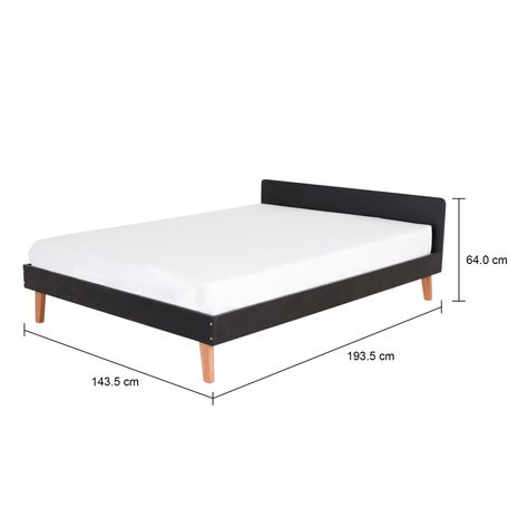 Cama de casal em MDP de 15 mm revestido com laminado melamínico baixa pressão com bordas em PVC. Possui pés e estrado em madeira maciça de reflorestamento (Eucalipto), sendo os pés tingidos com aplicação de verniz.