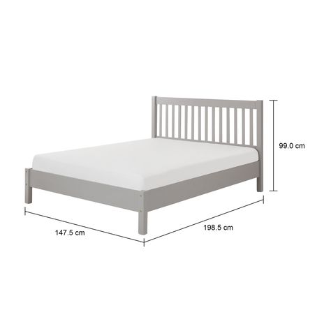 Cama de casal em madeira maciça (Pinus Elliottii) tingida com acabamento em verniz. Possui estrado maciço.