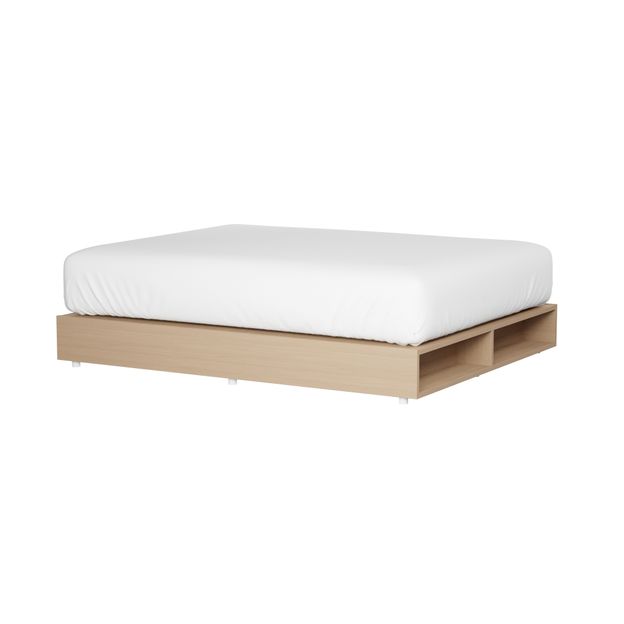 Cama queen em MDP (Medium Density Particleboard) de 18 mm com acabamento em pintura e aplicação de bordas em PVC. Possui estrado em madeira maciça (Eucalipto), 2 nichos frontais e pés plásticos.