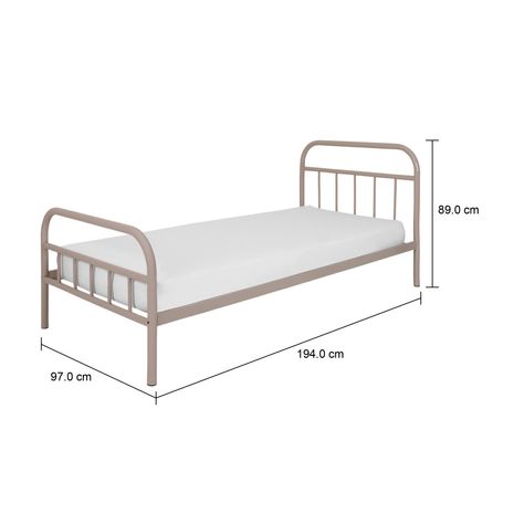Cama de solteiro em tubo de aço com acabamento em pintura epóxi-pó e estrado em madeira maciça de reflorestamento (Pinus Elliottii). Possui sapatas em polipropileno.