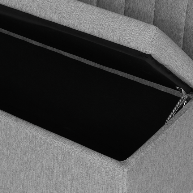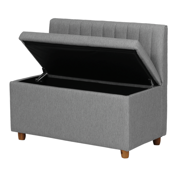 Possui baú com sistema de abertura basculante, pés maciços tingidos e chapa de união (no caso de uso com os demais módulos). Carga máxima suportável: 120kg/assento e 15kg/baú; distrubuídos uniformemente. Altura até o assento: 50,5 cm.