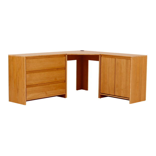 Armário modular em madeira maciça de reflorestamento (Pinus Elliottii) tingida com aplicação de verniz. Possui 2 portas com reforço antiempenamento e dobradiças com amortecedores, 2 nichos, sendo a prateleira regulável, e sapatas plásticas.Cômoda modular em madeira maciça de reflorestamento (Pinus Elliottii) tingida com aplicação de verniz. Possui 3 gavetas com corrediças telescópicas e sapatas plásticas.Escrivaninha modular de canto, em madeira maciça de reflorestamento (Pinus Elliottii) tingida com aplicação de verniz. Possui passa-fios e sapatas plásticas.