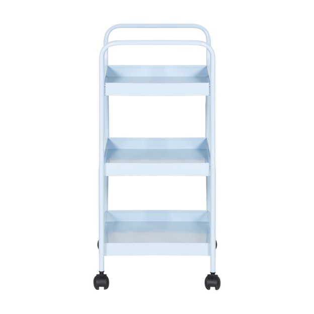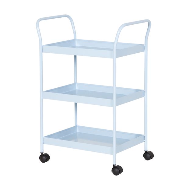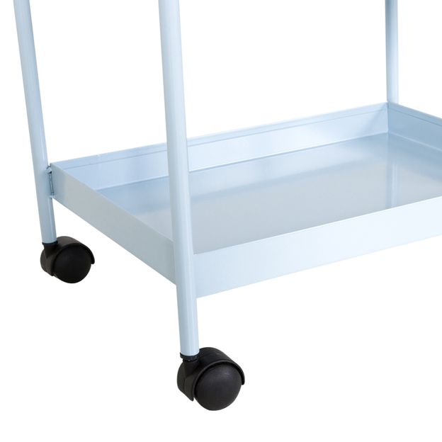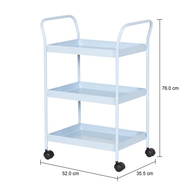 Carrinho em tubo e chapa de aço carbono com acabamento em pintura epóxi-pó. Possui 3 prateleiras, alças laterais para manuseio e rodízios plásticos sem travas.