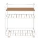 Carrinho em aramado de aço com acabamento em pintura epóxi-pó. Possui 3 prateleiras, sendo 1 em MDF (Medium Density Fiberboard) de 18 mm pintado e rodízios plásticos.