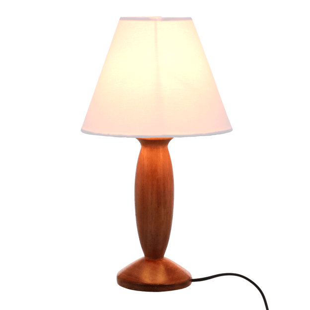 Base de luminária de mesa, 127/220V, em madeira maciça (Peroba Rosa) tingida com aplicação de verniz.Cúpula com estrutura em aramado de aço com acabamento em pintura epóxi-pó revestida com acetato e tecido 100% algodão.