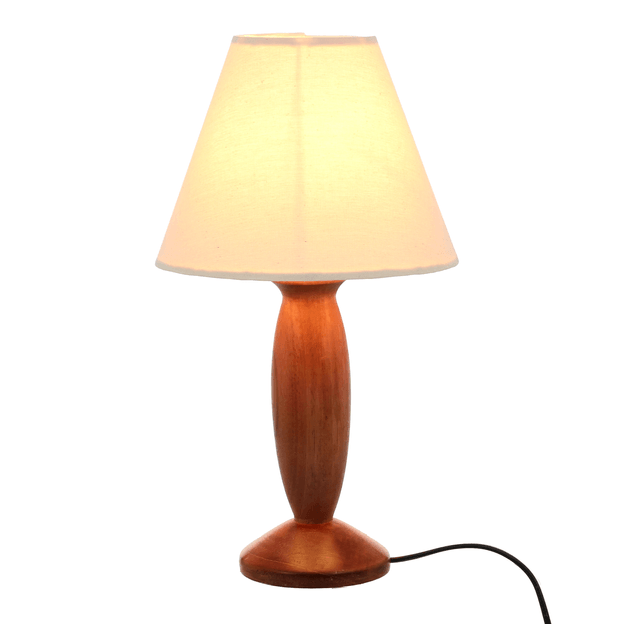 Base de luminária de mesa, 127/220V, em madeira maciça (Peroba Rosa) tingida com aplicação de verniz.Cúpula com estrutura em aramado de aço com acabamento em pintura epóxi-pó revestida com acetato e tecido 100% algodão.