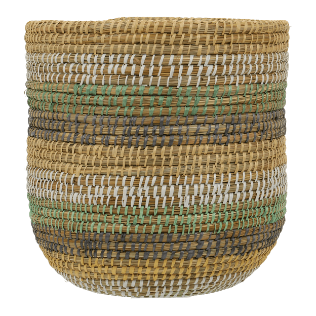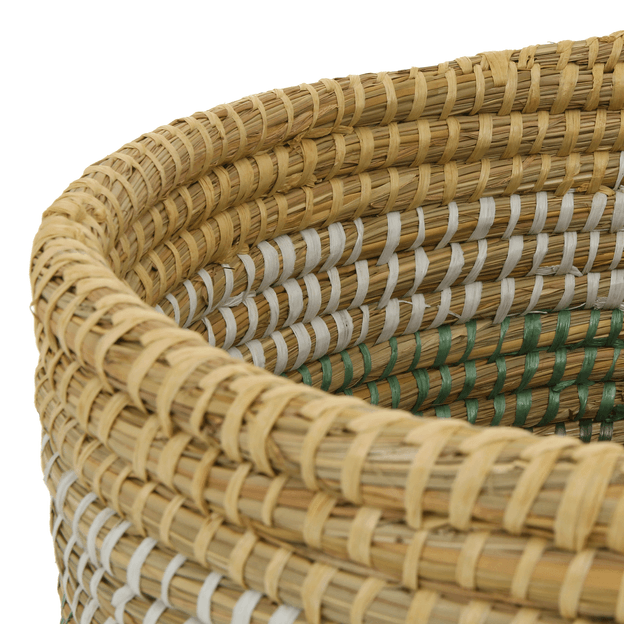 Cesto, confeccionado artesanalmente em fibra natural (Seagrass) com detalhes em fitas plásticas.