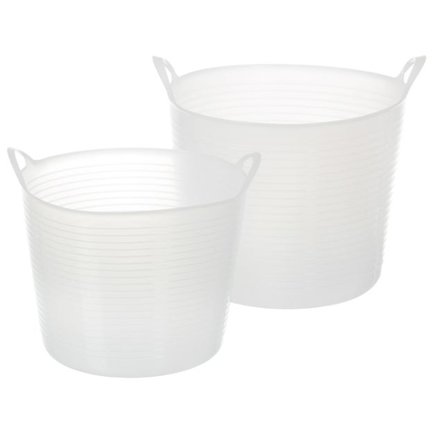 Cesto multiuso, flexível e com alças, em polietileno de baixa densidade.