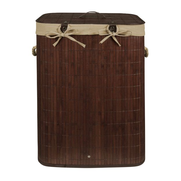 Cesto para roupa, confeccionado artesanalmente em bambu com base em compensado, estrutura em aramado e forro em tecido 60% poliéster/40% algodão.