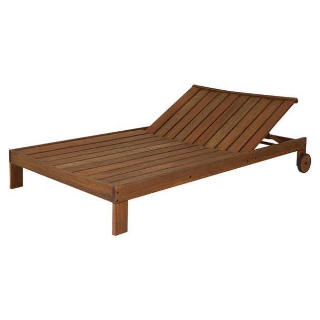Chaise longue em madeira maciça de reflorestamento (Eucalipto) com acabamento em tingidor impermeabilizante, tipo stain, com ação inseticida e fungicida. Possui regulagem em 4 posições no encosto e rodas na parte posterior.