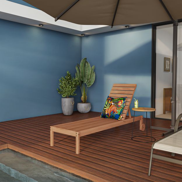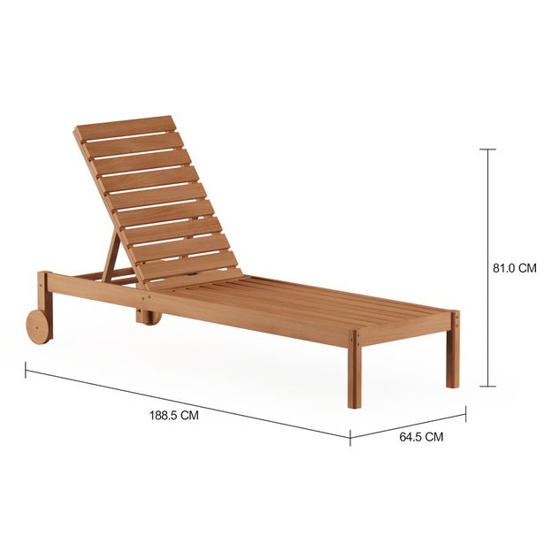 Chaise longue em madeira maciça de reflorestamento (Eucalipto) com acabamento em tingidor impermeabilizante, tipo stain, com ação inseticida e fungicida. Possui encosto regulável em 3 posições e rodas na parte posterior.