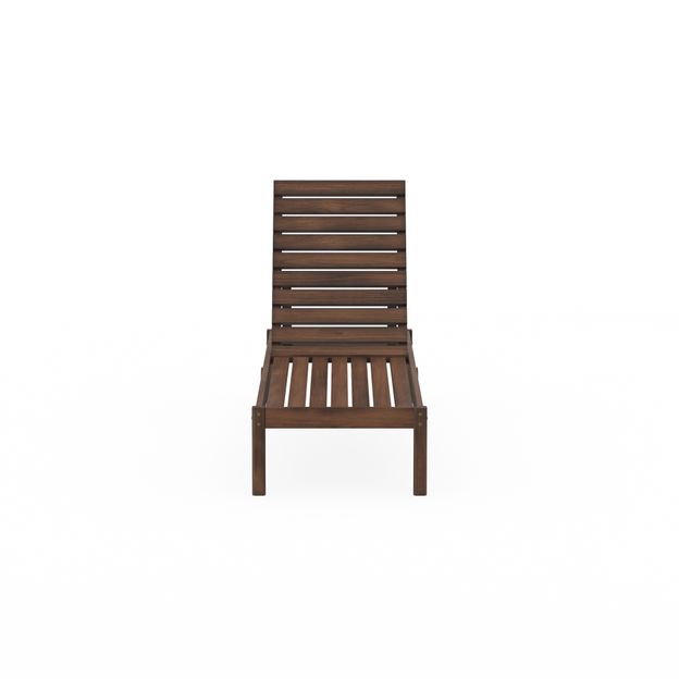 Chaise longue em madeira maciça de reflorestamento (Eucalipto) com acabamento em tingidor impermeabilizante, tipo stain, com ação inseticida e fungicida. Possui encosto regulável em 3 posições e rodas na parte posterior.