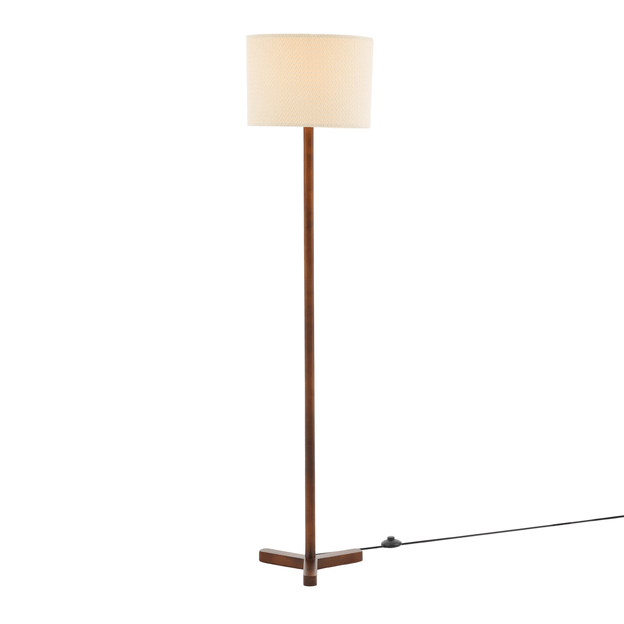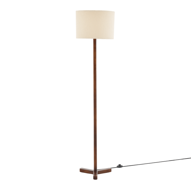 Base de luminária de piso, 127/220V, com estrutura em madeira maciça (Pinus Elliottii) com acabamento em verniz. Possui sapatas plásticas.Cúpula com estrutura em aramado de aço com acabamento em pintura epóxi-pó revestida com acetato e tecido 100% algodão.