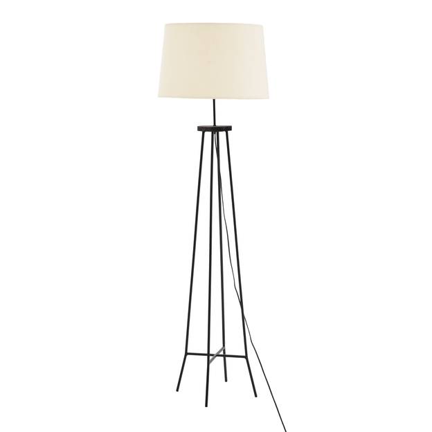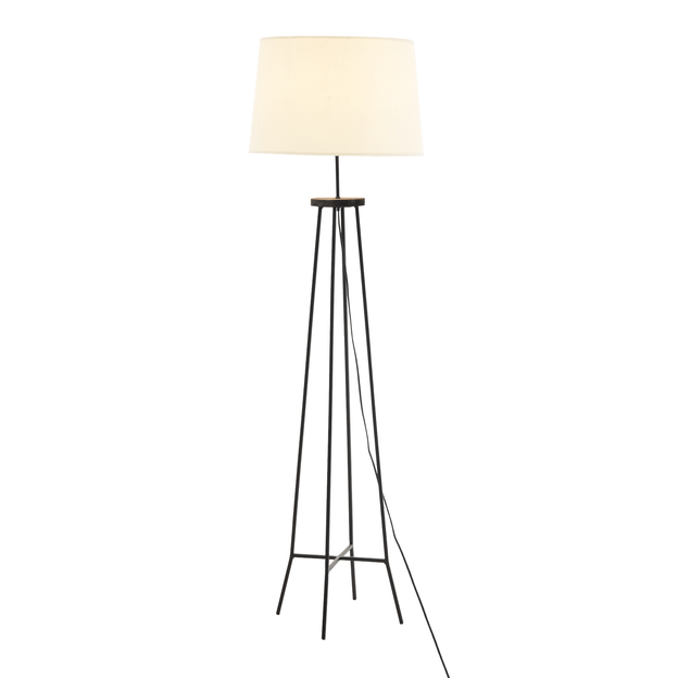Base de luminária de piso, 127/220V, com estrutura em perfil de aço maciço com acabamento em pintura epóxi-pó e madeira maciça (Pinus Elliottii) com detalhes desgastados e aplicação de verniz. Possui sapatas plásticas.Cúpula com estrutura em aramado de aço com acabamento em pintura epóxi-pó revestida com acetato e tecido 100% algodão.