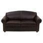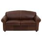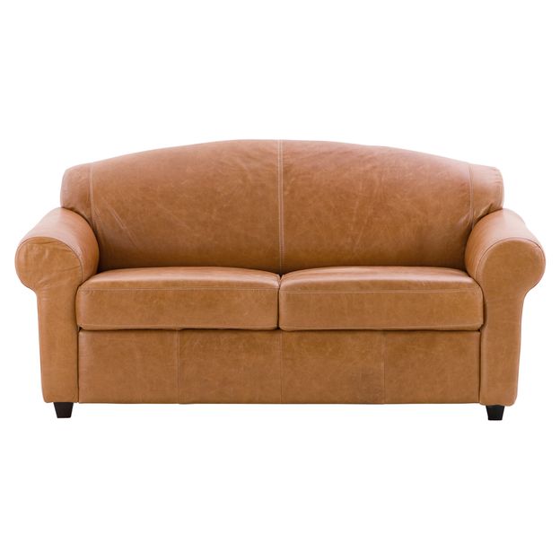 Sofá em couro encerado com estrutura em madeira maciça (Pinus Elliottii), OSB (Oriented Strand Board), compensado, molas e percintas elásticas com espuma (D28/assento, D20/encosto e D28/braços). Possui detalhes em pespontos e pés maciços pintados.