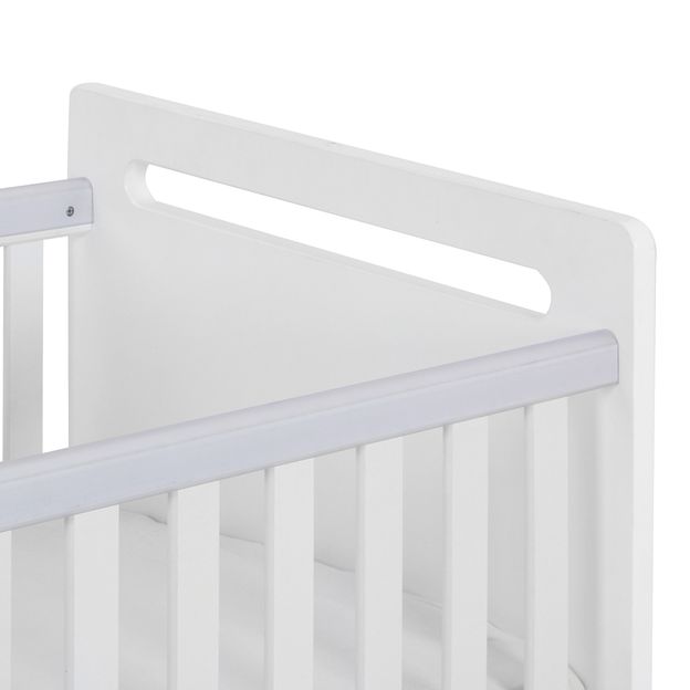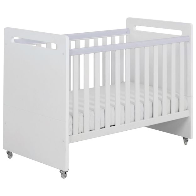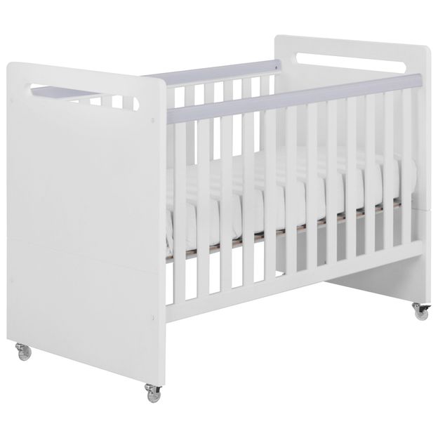 Berço em MDF (Medium Density Fiberboard) com acabamento em pintura atóxica. Possui estrado com furos para ventilação do colchão e 3 regulagens de altura, e rodízios em poliuretano, sendo 2 com travas.