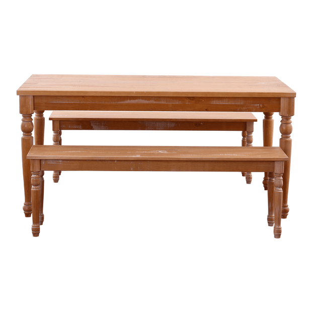 Banco 3 lugares, em madeira maciça de reflorestamento (Pinus Elliottii) tingida com acabamento desgastado e aplicação de verniz. Possui pés maciços torneados.Mesa em madeira maciça de reflorestamento (Pinus Elliottii) tingida com acabamento desgastado e aplicação de verniz. Possui pés maciços torneados.
