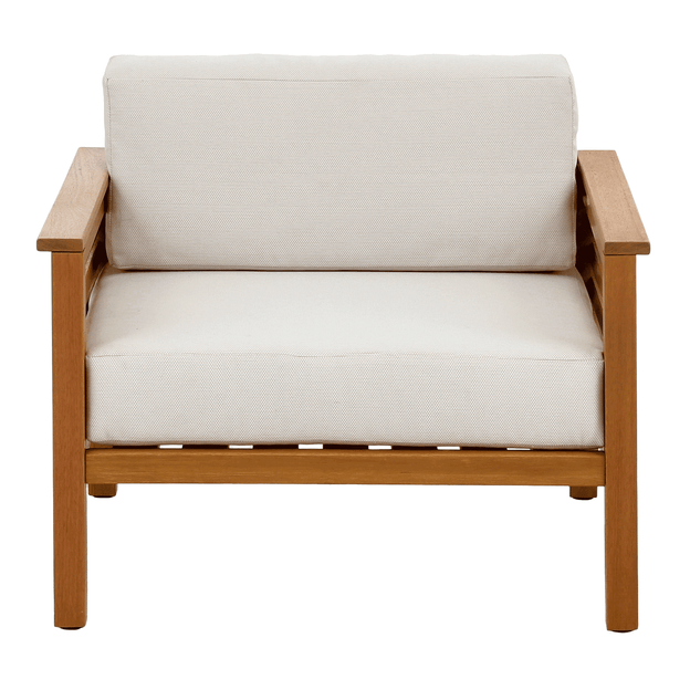 Conjunto de almofadas com enchimento em espuma de poliuretano (D20), revestidas com tecido pet friendly 68% algodão/32% poliéster, com tratamento hidrorrepelente, proteção UV, ação antimicrobiana, anti-pilling e resistência à luz.Estrutura de poltrona em madeira maciça de reflorestamento (Eucalipto) certificada 'FSC®', com aplicação de verniz tingidor com proteção contra raios UV. Possui sapatas plásticas.