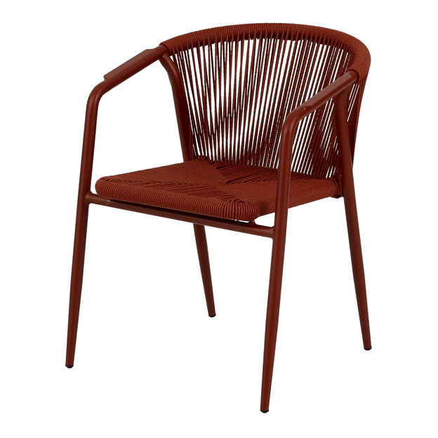 Cadeira com braços, empilhável, com estrutura em tubo de alumínio com acabamento em pintura e escovamento manual. Possui assento/encosto em corda de polietileno trançada, filtro de proteção contra radiação UV e sapatas plásticas.