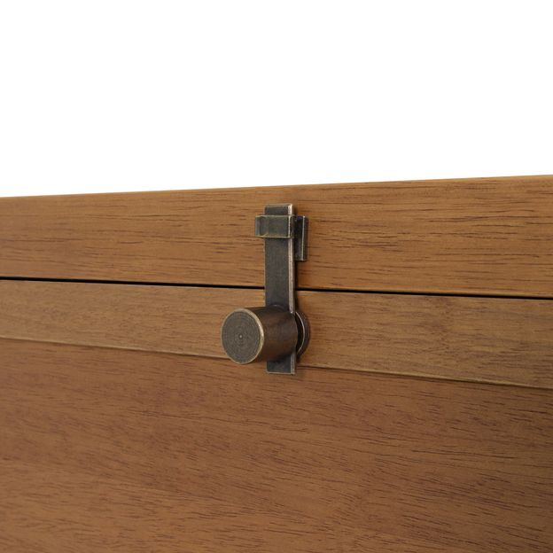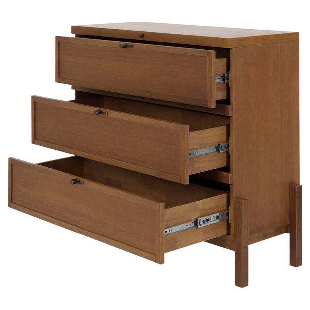 Cômoda em madeira maciça (Tauari) revestida com lâmina natural (Tauari), tingidas com acabamento encerado. Possui 3 gavetas com corrediças telescópicas com puxadores em metal com acabamento envelhecido.