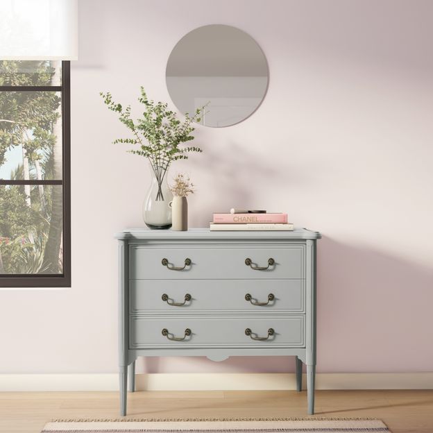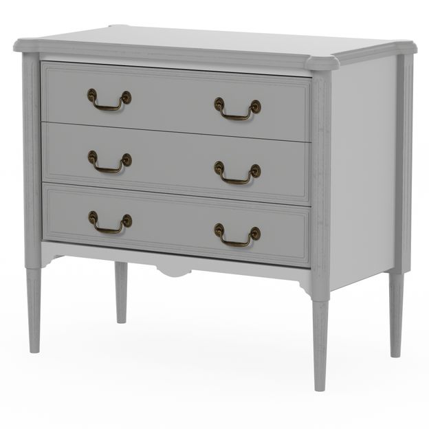 Cômoda em MDF (Medium Density Fiberboard) e madeira maciça de reflorestamento (Pinus Elliottii) pintados com acabamento desgastado. Possui 3 gavetas com corrediças metálicas e puxadores em zamac com acabamento envelhecido.