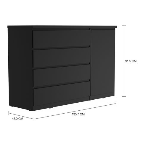 Cômoda em MDP (Medium Density Particleboard) de 15 mm e 25 mm com acabamento em pintura. Possui 1 porta com 2 nichos, 4 gavetas com corrediças telescópicas e sapatas plásticas.