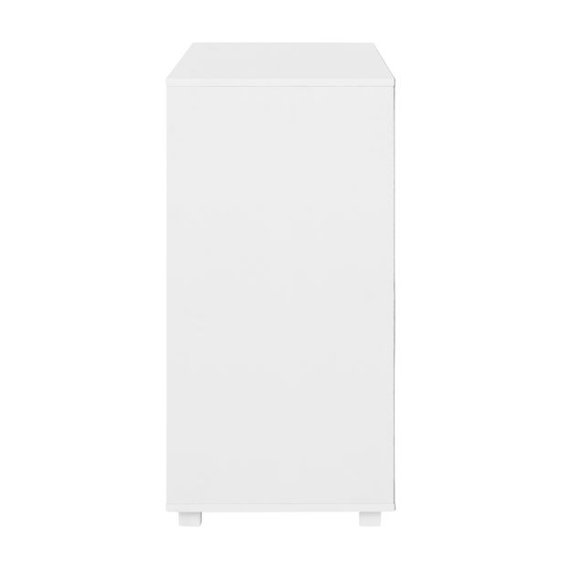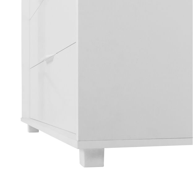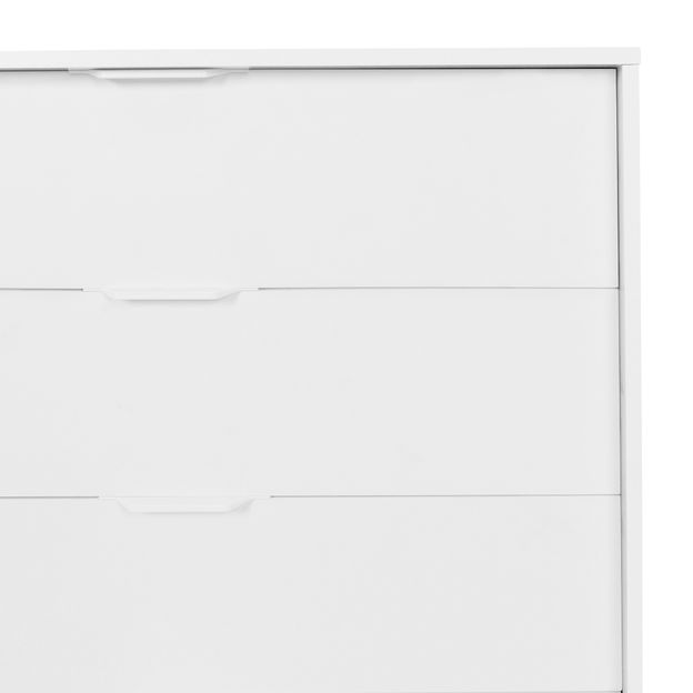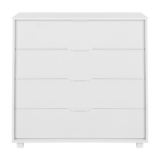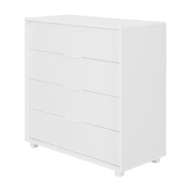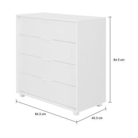 Cômoda em MDP e MDF de 15 mm com acabamento em pintura UV. Possui 4 gavetas com corrediças telescópicas, puxadores e pés em PVC.
