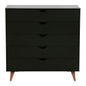 Cômoda em MDP de 15 mm revestido com laminado melamínico baixa pressão com bordas em PVC. Possui 5 gavetas com corrediças metálicas pés em madeira maciça de reflorestamento (Eucalipto) tingida.