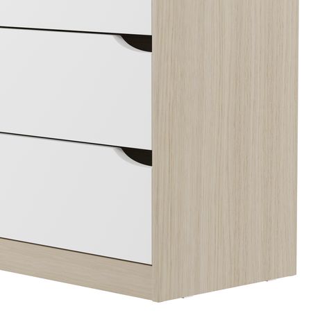Cômoda em MDF (Medium Density Fiberboard) com acabamento em pintura por impressão. Possui 6 gavetas em MDF com corrediças metálicas, 2 nichos e sapatas plásticas.