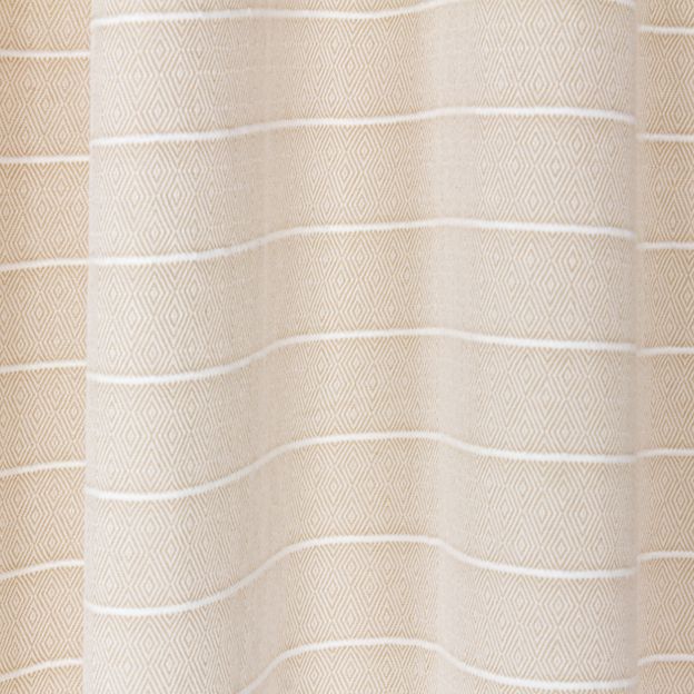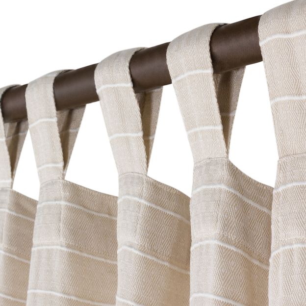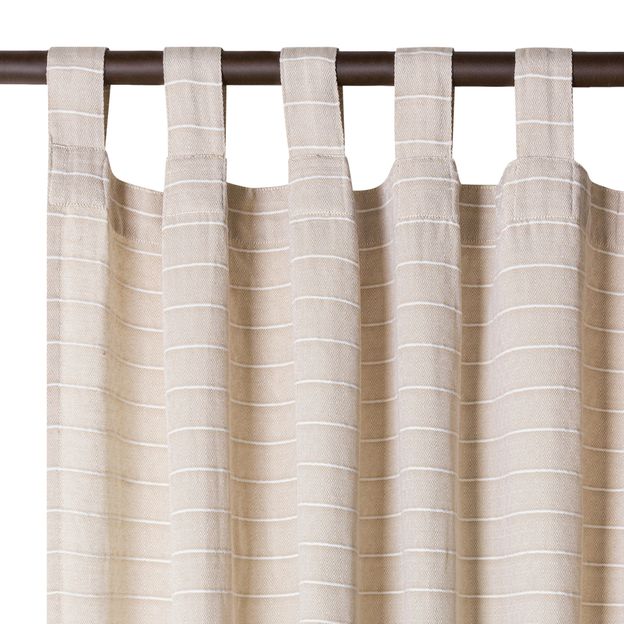 Cortina, em duas peças (com 1,40 m x 2,50 m cada), em tecido 55% poliéster/ 45% algodão. Possui alças para fixação em varões.