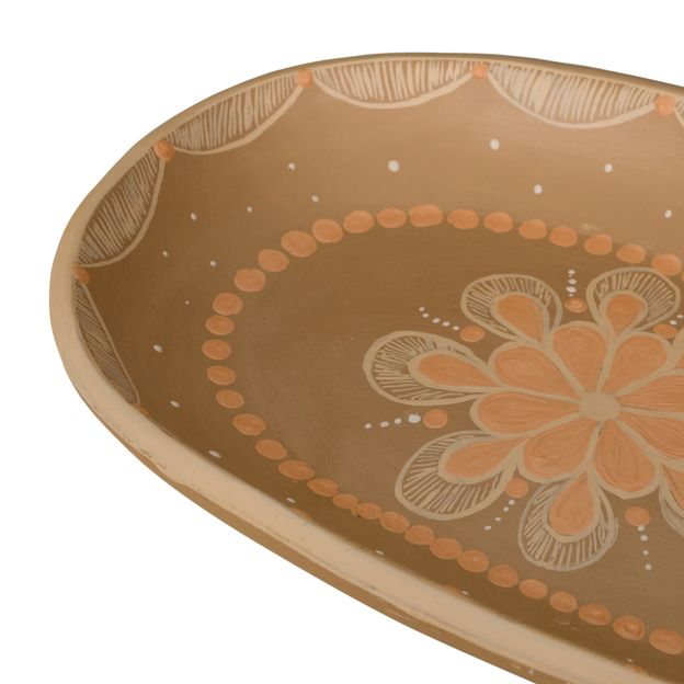 Travessa confeccionada artesanalmente em barro com acabamento em pintura à mão à base de tinta oleio.