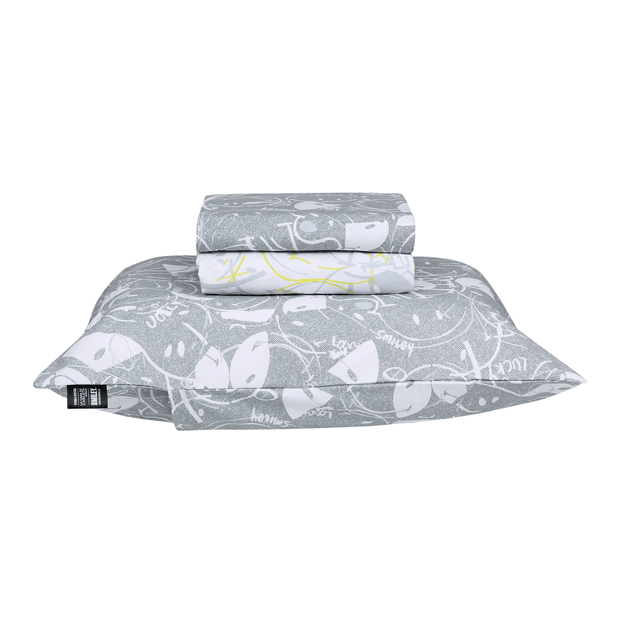 Criado pelo jornalista Franklin Loufrani em 1972 para destacar boas notícias e com o slogan 'tire tempo para sorrir', Smiley é um ícone cultural que atravessa décadas espalhando positividade e esperança.Como felicidade nunca sai de moda, a Tok Stok em colaboração com a Smiley e La Casa de Carlota - estúdio ativista com sede em vários países que atua com talentosos criativos neurodivergentes - unem esforços e visões para habitar as casas de todo o Brasil.Como resultado, temos a coleção Smiley Doodles que valoriza o traço artístico desde os primeiros rabiscos de sorrisos soltos e desconstruídos em preto, branco, cinza e amarelo, é claro!Surpreenda o seu ambiente com uma proposta repleta de inspirações. Com estampas lúdicas, as roupas de cama da linha Smiley são a escolha certa para quem deseja ambientar espaços com atmosfera divertida e proposta personalizada. Confeccionadas em tecido 100% algodão percal com 180 fios, elas possuem os atributos ideais para uma noite tranquila, não aquecem nos dias quentes e nem agridem a pele; combinação perfeita de maciez e aconchego para os seus momentos de descanso. E assim, somando superpoderes, inspiramos as pessoas a tornar o mundo mais justo e feliz.Seja sorridente, seja Smiley!Composto por 1 fronha para travesseiro, 1 lençol para cama solteiro 1,60 M X 2,40 M e 1 lençol com elástico para cama solteiro, fabricados em tecido estampado 100% algodão percal (180 fios).