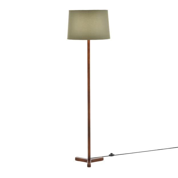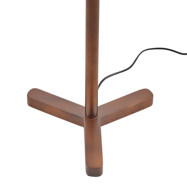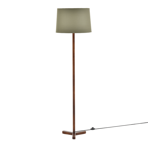 Base de luminária de piso, 127/220V, com estrutura em madeira maciça (Pinus Elliottii) com acabamento em verniz. Possui sapatas plásticas.Cúpula com estrutura em aramado de aço com acabamento em pintura epóxi-pó revestida com acetato e tecido 53% algodão/47% polipropileno.