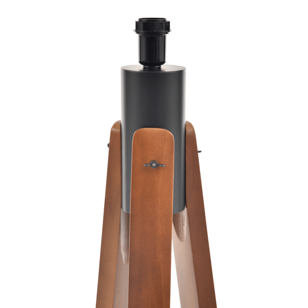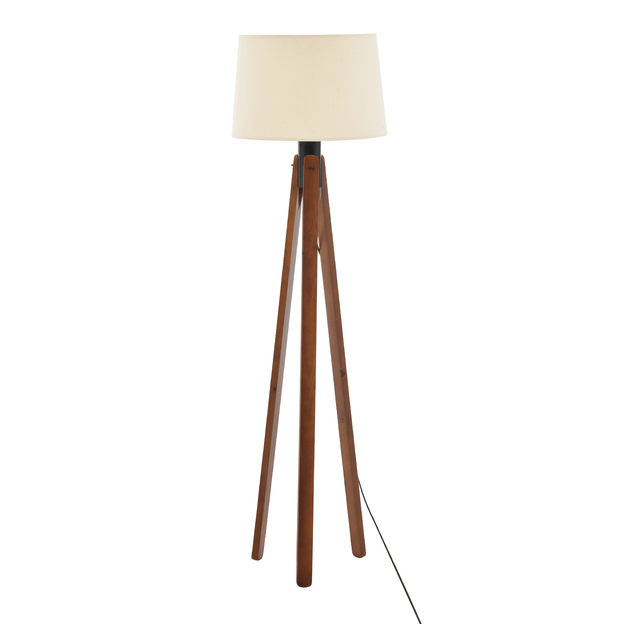 Base de luminária de piso, 127/220V, em madeira maciça de reflorestamento (Eucalipto) tingida com aplicação de verniz.Cúpula com estrutura em aramado de aço com acabamento em pintura epóxi-pó revestida com acetato e tecido 100% algodão.
